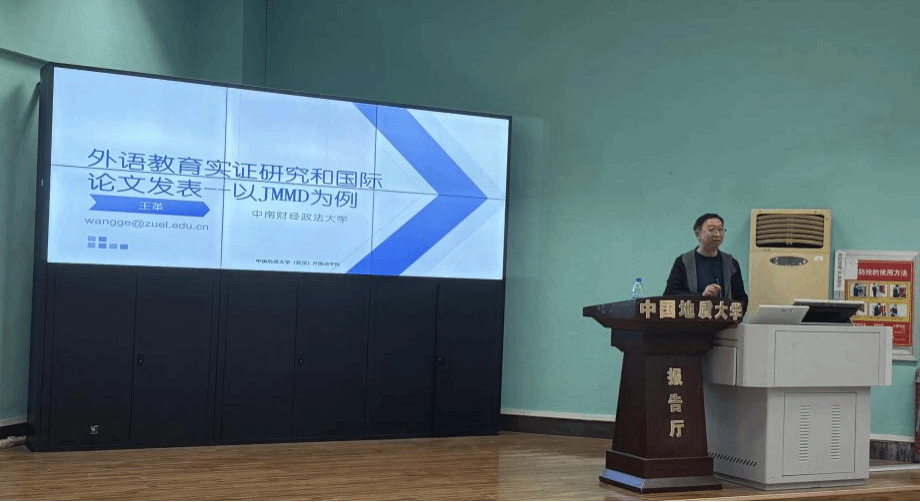 (通讯员:王可可 摄影:于鑫鑫、王子妍)2025年11月13日14:30,中国地质大学(武汉)外国语学院“南望今声”外语论坛系列讲座第77期在北一楼学术报告厅举行。中南财经政法大学王革教授应邀莅临中国地质大学(武汉)外国语学院,作题为“实证研究和国际论文发表:以国际核刊JMMD为例”的学术讲座。外国语学院张伶俐副院长主持讲座,师生共100余人参与学习交流。