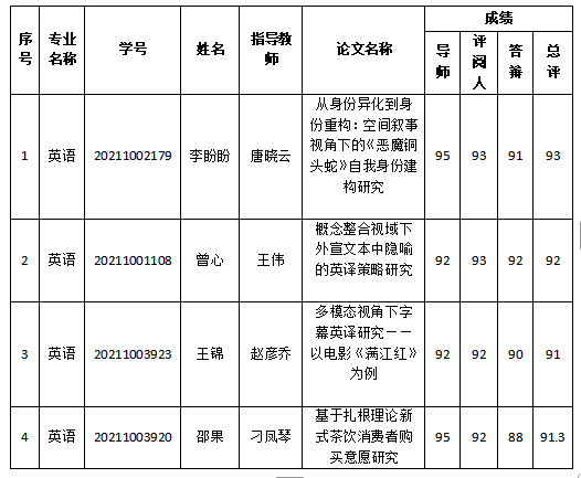 根据本科生院《关于做好2025届本科毕业论文(设计)答辩及优秀本科毕业论文(设计)评选工作的通知》和《本科毕业论文(设计)工作管理办法》中有关优秀本科毕业论文评选通知和流程,经外国语学院学术委员审定,拟推荐李盼盼、曾心、王锦、邵果, 共 四位同学的学士学位论文为校级优秀毕业论文。名单公示如下:
