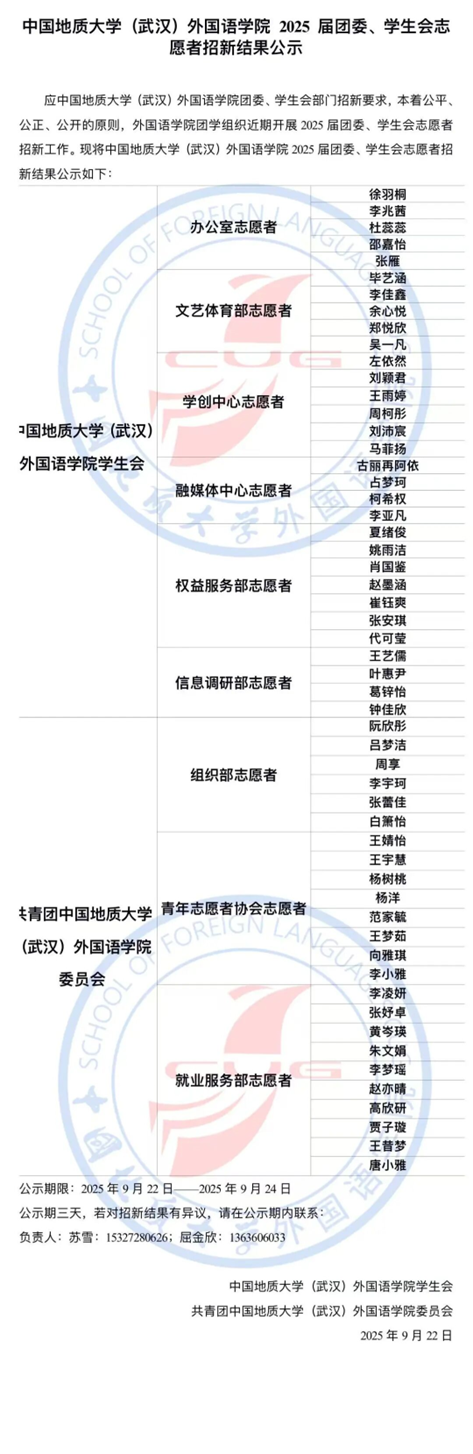 应中国地质大学(武汉)外国语学院团委、学生会部门招新要求,本着公平、公正、公开的原则,外国语学院团学组织近期开展2025届团委、学生会志愿者招新工作,现将中国地质大学(武汉)外国语学院 2025 届团委、学生会志愿者招新结果公示如下: