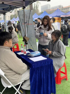 上午九点半,招聘会现场已是人来人往。外国语学院的同学们手持简历,在不同展位间穿梭咨询。在330教培类展位前,几位同学正围着招聘老师询问英语老师的任职要求。对方介绍,目前小学、初中阶段的教师缺口较大,第一年不做教资硬性要求,但需要通过试讲环节。
