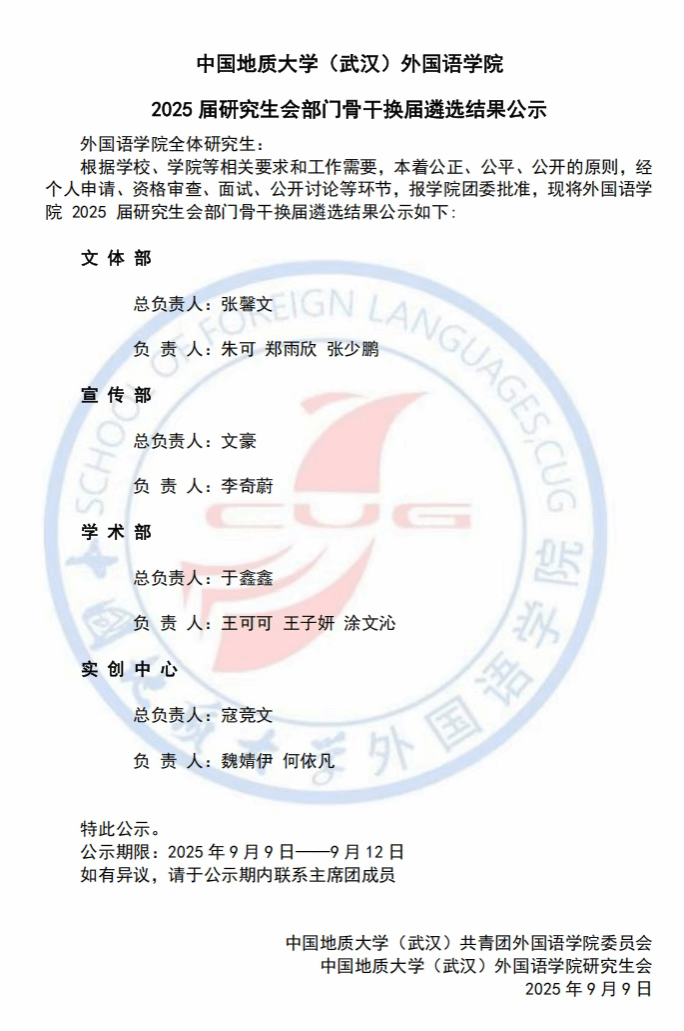中国地质大学(武汉)外国语学院2025届研究生会部门骨干换届遴选结果公示