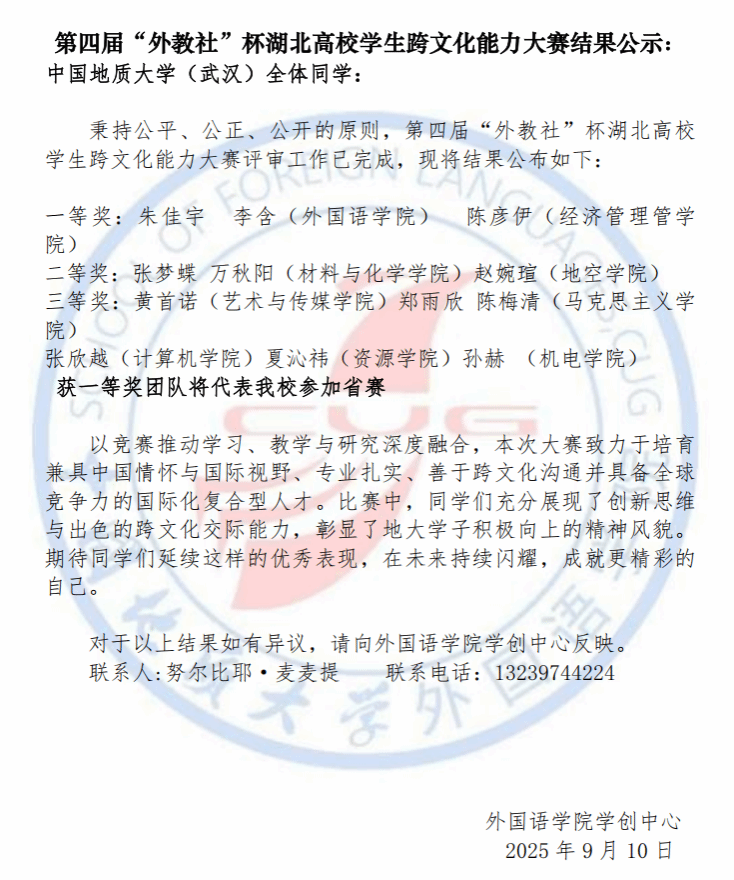 中国地质大学(武汉)外国语学院2025届研究生会部门骨干换届遴选结果公示