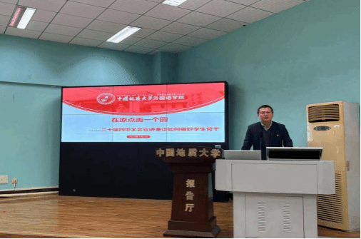 在随后的“语翼”团校第一课中,余尚蔚面向全体学员宣讲二十届四中全会精神,他从全会提到的“人民”“全面”“现代化”“高质量”“发展”等8个高频词出发引导学员思考高频词背后蕴含的深意,从五个切入点把握全会的精神。他指出,全会的目标任务是对新时代青年成长成才的召唤,是需要包括全体团学骨干在内的大学生厚植家国情怀、练就过硬本领、扎实奉献实践才会实现的。他强调,团校是培养团员骨干的重要阵地,是共青团为党育人、为国育才的关键一环。围绕这一培养目标,学生骨干要以坚定理想信念为根、以服务奉献为本、以自我锻炼为途,做到“有魂”、“有心”、“有心”、“有根”、“有为”。要强化思想政治觉悟,做坚定信念的引领者;提升沟通协作能力,做组织发展的推动者;明晰自身定位、坚守责任担当,激发内生动力、追求卓越实效。他希望,学员们要珍惜学习机会,在服务同学的实践中不断拓展自身成长的“圆”,以实际行动绘就新时代外国语学院团学骨干画像,努力成长为有品德、有品质、有品位、具备全球胜任力的时代新人。授课最后,他对全体学生党员和骨干提出要以更高的标准、更严的要求、更实的行动提升自己,努力在遵规守纪方面作表率;要提高鉴别能力、增强防范意识、提高斗争本领、加强警示提醒,努力在防诈骗和守安全方面做榜样示范和教育服务。